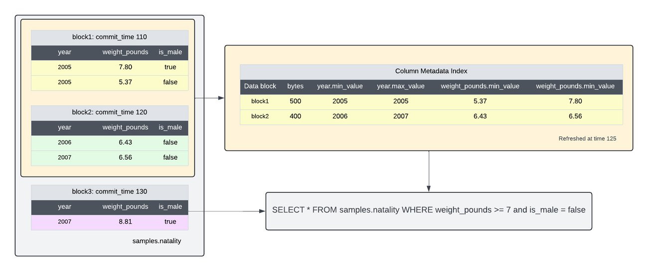 With this design, a table’s metadata can grow linearly with the data itself without ever becoming a system-level bottleneck.