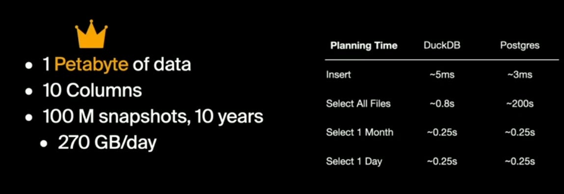 In a recent presentation, Prof. Hannes Mühleisen claims that DuckLake can easily handle petabyte-scale data, citing tests conducted on a table with 100 million snapshots.