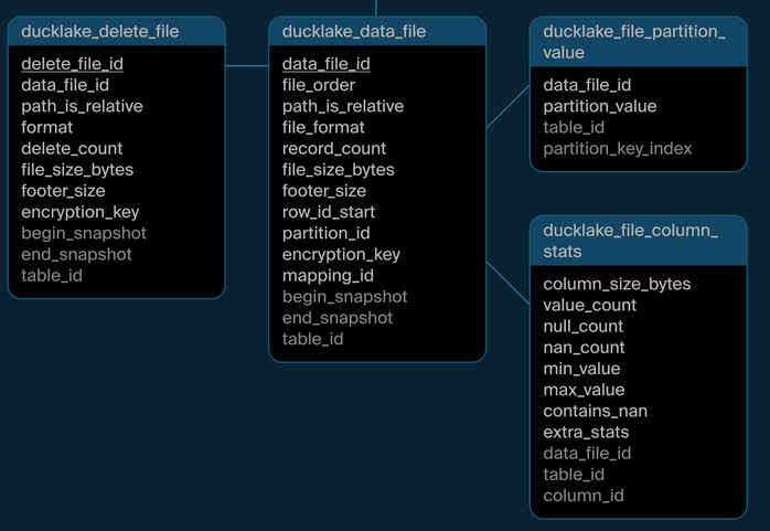 DuckLake eliminates this bottleneck by tracking all data files and storing column-level statistics for each file in the metadata layer, just like modern open table formats. The critical difference is that these details live in relational database tables rather than scattered log files.
